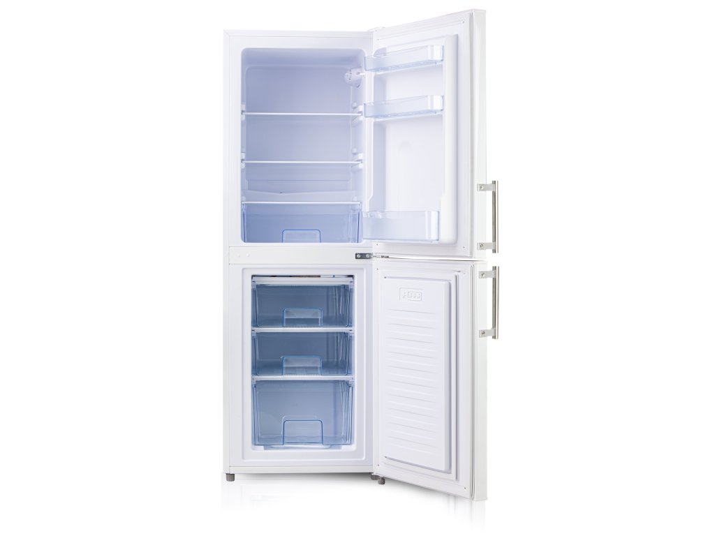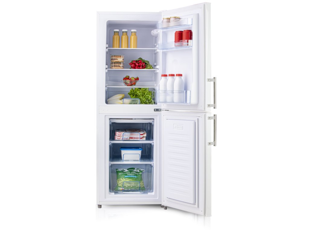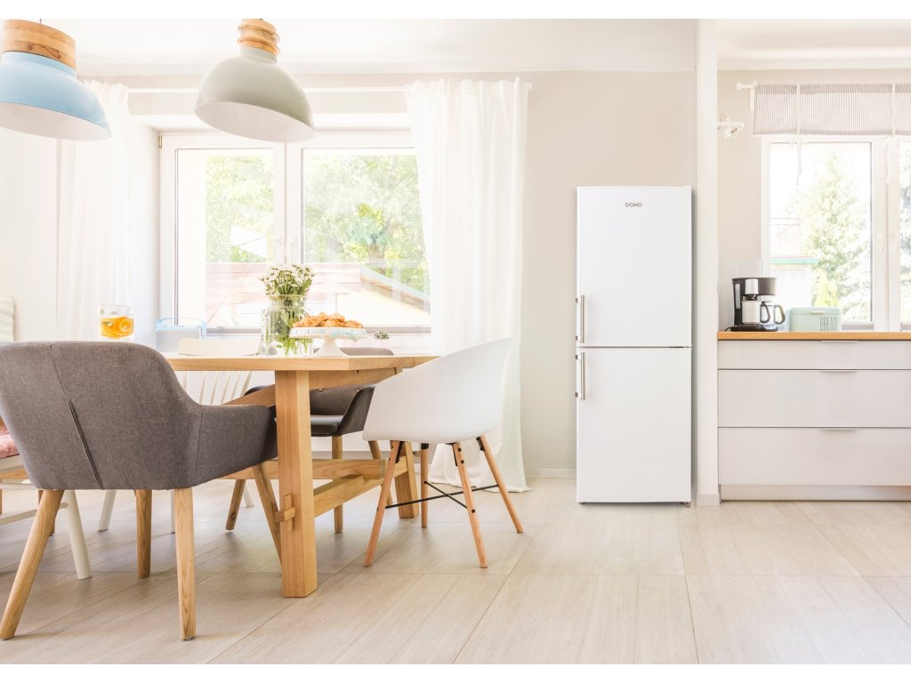 Velmi úsporná a moderní kombinovaná lednice DOMO DO91304C. Energetická třída C zaručujeme průměrnou roční spotřebu 118 kWh/rok. Vnitřní prostor je rozdělen do 95 litrové lednice + 45 litrů mrazák, který je ve spodní části přístroje. Objem mrazáku napovídá, že je přístroj vhodný zejména pro menší rodiny, které i přesto preferují nakupování do zásoby a jejich zamražení. Dveře jsou vybaveny robusními madly z hliníku.
