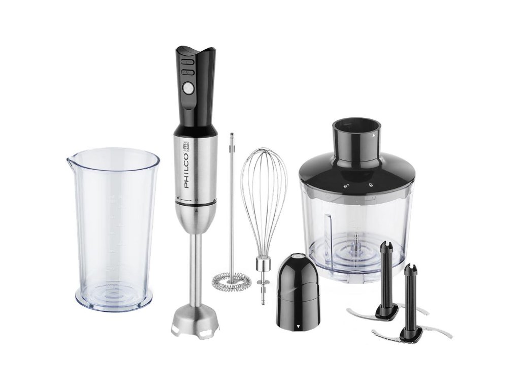 Tyčový mixér s nerezovým ponorným nástavcem v sadě s nerezovou šlehací metlou, mini sekáčkem s 0,5 l nádobou a 0,7 l nádobou s odměrkou. Vysoký příkon 600 W s plynulou regulací.