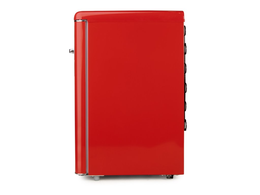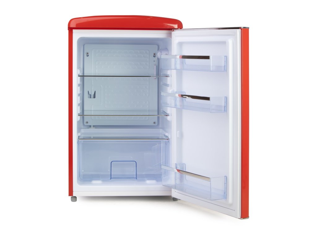 Kompaktní retro lednice s vnitřním objemem 120 litrů v lesklé červené barvě perfektně zapadne do moderního interiéru vašeho bytu. Retro styl jse doplněn chromovaným madlem a chromovanou linkou na dveřích. Nízká erergetická náročnost se spotřřebou jen 71 kWh/rok.