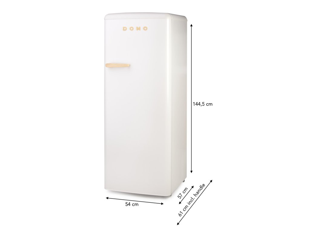 Volně stojící chladnička DOMO DO91709R dodá vaší kuchyni retro nádech. Tato elegantní retro chladnička v bílé barvě a s rukojetí ve vzhledu dřeva kombinuje design s funkčností.