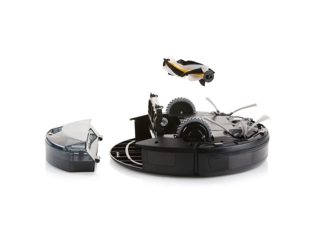 - V balení jsou: dálkové ovládání, nabíjecí stanice s adaptérem, 2 boční náhradní kartáče, 1 náhradní HEPA