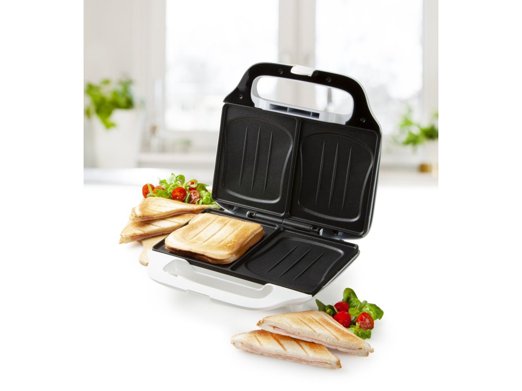 pro přípravu 4 trojúhelníčkových sendvičů, bílá barva v kombinaci s nerezí, nepřilnavá povrchová úprava pečících ploch, tepelně izolovaná rukojeť, indikátor připojení k síťové...