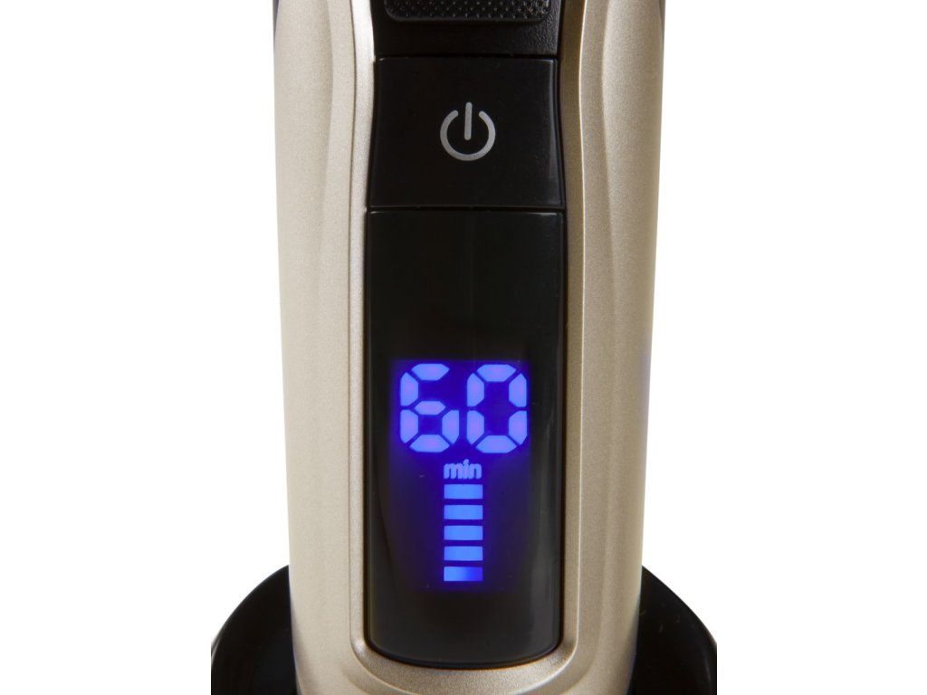 Bezdrátový zastřihovač vlasů a vousů s Li-Ion akumulátorem. Provoz na jedno nabití až 60 minut. Ve střihání lze pokračovat i při vybité baterii po připojení síťového kabelu. Profesionální výsledky a precizní zastřižení vám zajistí ocelová střihací hlava s titanovým povrchem a pohyblivým keramickým břitem. Výšku střihu lze plynule měnit přímo na přístroji po 0,5 mm krocích mezi 0,5-2,5 mm, nebo můžete využít klasické hřebenové nástavce s různými výškami střihu, či hřeben určený na prostřihování vlasů. Zbývající kapacitu baterie v minutách lze pak sledovat na přehledném LED displeji. Při nabíjení lze zastřihovač také umístit do nabíjecího stojánku, který je součástí balení.