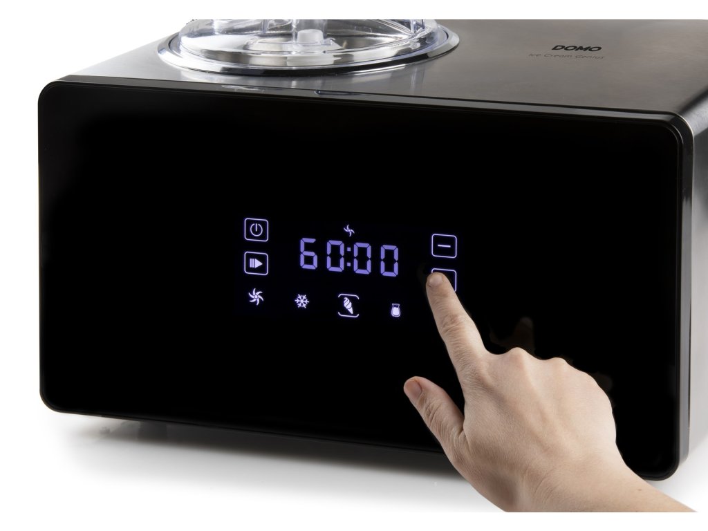 Samochladící domácí zmrzlinovač v moderním designu s velkým dotykovým panelem a nerezovým tělem. Zmrzlinovač umí připravit do 60 minut až 1,5 litru zmrzliny a následně zmrzlinu dále udržovat další 2 hodiny vychlazenou.